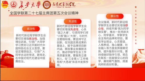 员工会秘书处马亚宁向全体同学传达了全国学联第二十七届主席团第五次会议精神。 会议精神强调,新时代新征程,学联员工会要切实增强政治性、先进性、群众性。员工会组织工作人员和广大同学要高举中国特色社会主义伟大旗帜,学习好、宣传好、贯彻好此次会议精神。