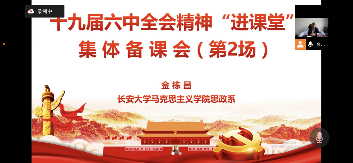 2022年4月15日下午,思政系全体教师举行“党的十九届六中全会精神‘进课堂’”线上集体备课会,本次备课会由系主任曹爱琴老师主持,思政系全体教师参加。金栋昌老师围绕“树立正确的唯物史观和党史观”的主题分享相关课程建设思路。
