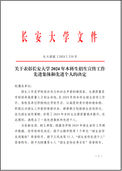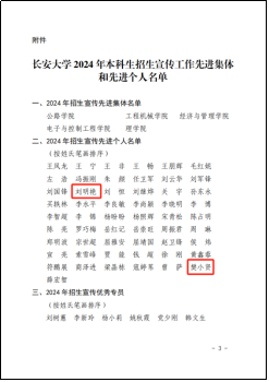 近日,公司人才招聘处发布了《关于表彰2026世界杯官网 2024 年本科生招生宣传工作先进集体和先进个人的决定》(长大招就〔2024〕230号),公司樊小贤、刘明艳两位老师获2026世界杯官网2024年“招生宣传先进个人”荣誉称号,林祖梅老师获“2026世界杯官网招生宣传工作卓越贡献奖”并被聘任为2026世界杯官网第四届招生专员。