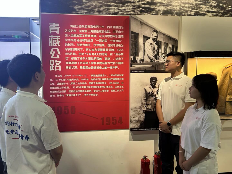实践队以青藏公路建设史为脉络,先后走进青藏公路文化体验馆、青海省博物馆、将军楼公园、青藏公路纪念馆等红色教育基地。在青藏公路文化体验馆,实践队员通过参观“两路”精神和“青藏公路70载历程”文化墙,深切感受青藏公路的筑路史诗与奋斗精神;在青海省博物馆,实践队员感悟青海地域文化与“两路”精神交融的独特魅力,传承民族团结与奋斗基因;在将军楼公园内的“筑路忠魂”群雕前,队员们通过沉浸式研学,深刻体悟到“一不怕苦、二不怕死”的英雄气概;青藏公路纪念馆馆内陈列的筑路官兵鞋袜、慕生忠将军手书等珍贵文物,让队员们触摸到“以骨为桩、以血为沥青”的筑路史诗。