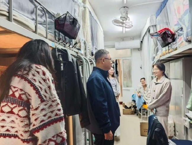 在走访高年级员工宿舍时,冯迪细致询问了同学们的毕业规划与近期进展,针对备战考研的同学,他鼓励大家坚定目标、劳逸结合,以扎实积累迎接挑战;对积极求职的同学,他勉励大家明确方向、把握机遇,在实践中提升综合能力。在低年级宿舍,冯迪亲切询问课程学习、生活起居等日常细节,叮嘱同学们尽快完成角色转换,科学规划学业,培养良好习惯,注重身心健康,积极融入集体生活。