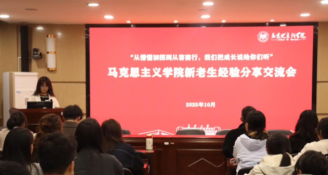 刘堃作总结发言。刘堃对四位同学的分享表示感谢与肯定,向新生提出三点殷切期望:一是勤学笃行,全面发展,在知行合一中锤炼过硬本领;二是调节心态,主动沟通,以积极心态应对成长挑战;三是做好职业生涯规划,以清晰目标引领学业发展与人生航向。刘堃鼓励全体新生以优秀学长学姐为榜样,努力成长为积极进取、求真务实、勇于担当的马院学子。