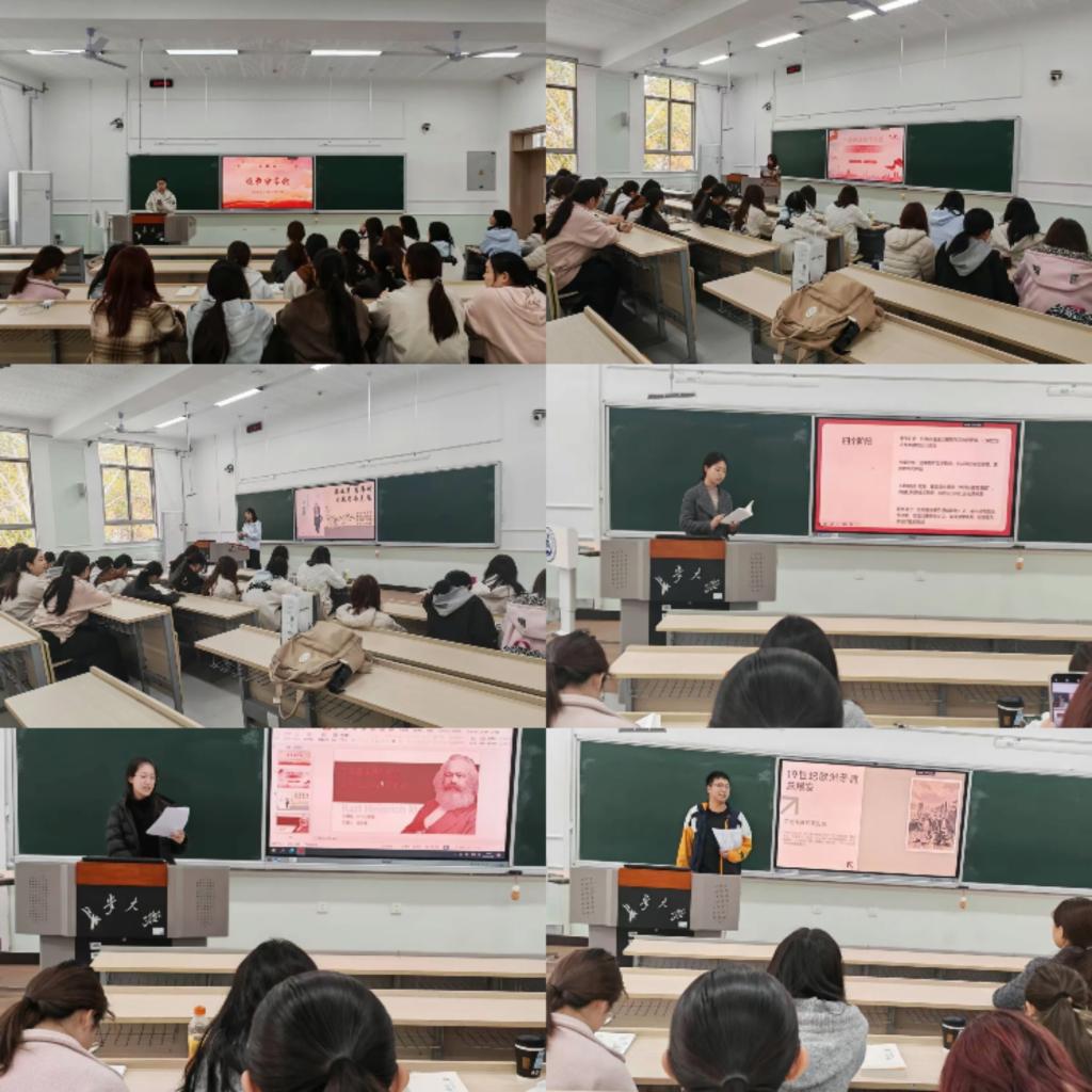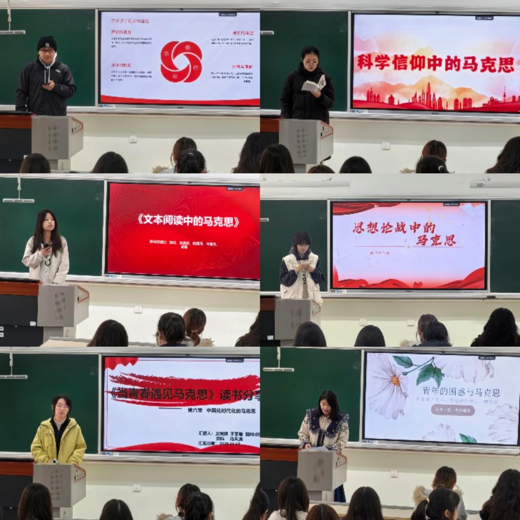 二班六个小组同样亮点纷呈:第一组聚焦“青年的困惑与马克思”,强调个人价值与社会联结;第二组围绕“马克思主义中国化时代化”,回顾其在中国的传播实践,号召将个人发展融入民族复兴;第三组进行系统性导读,梳理全书核心脉络,引导理论内化与实践落地;第四组从“历史深处的马克思”出发,分享青年视角下马克思的人生细节,传递思想的现实关怀;第五组以“思想论战中的马克思”为核心,强调独立思考与理论联系实际;第六组介绍马克思主义文本阅读方法,助力经典阅读与思想转化。