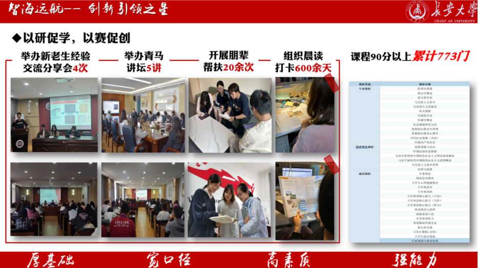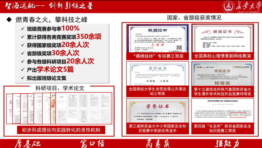 “惟创新者进,惟创新者强,惟创新者胜。”班级成员锐意求新,学业成绩斐然,3人获国家奖学金,各类学业奖项覆盖率达83.5%,90分以上课程累计达773门次。依托宿舍单位设立学习小组,实施“领航计划”,开展晨读打卡、朋辈帮扶等活动20余次,累计获得第十九届“挑战杯”主体赛全国二等奖、2025全国老员工新文科实践创新大赛银奖、“挑战杯”揭榜挂帅全国三等奖等国家级奖项20余人次,第三届“长安杯”陕西省大中小学国家安全知识竞赛一等奖、陕西省老员工铸牢中华民族共同体意识知识竞赛一等奖等省部级奖项30余人次。积极参与各级科研项目30余项,产出学术论文5篇,拟出版班级论文集,初步形成理论向实践转化的良性机制。