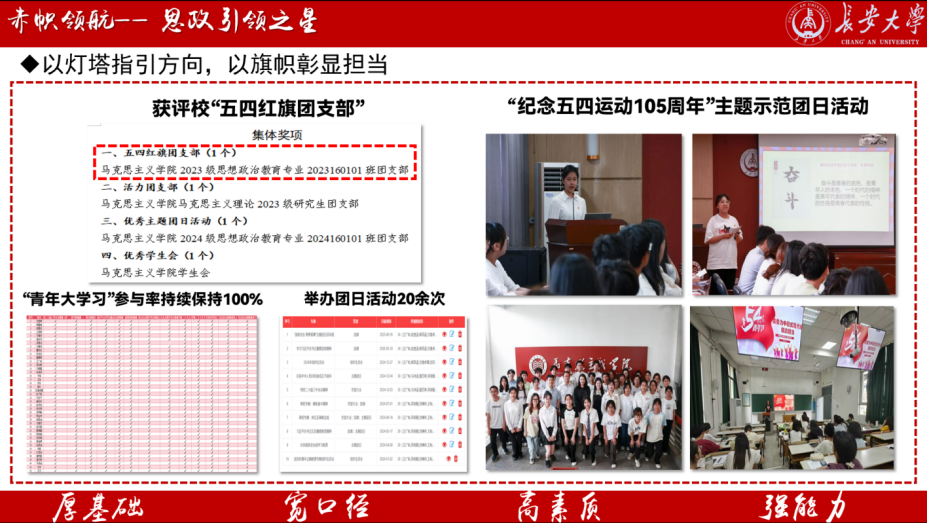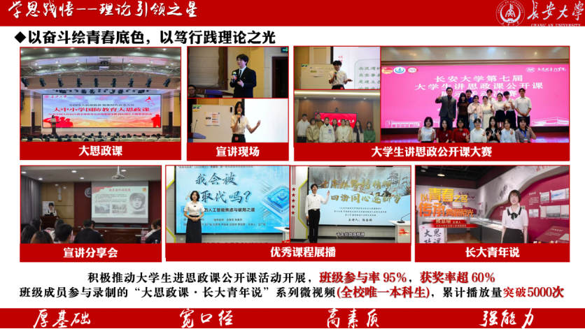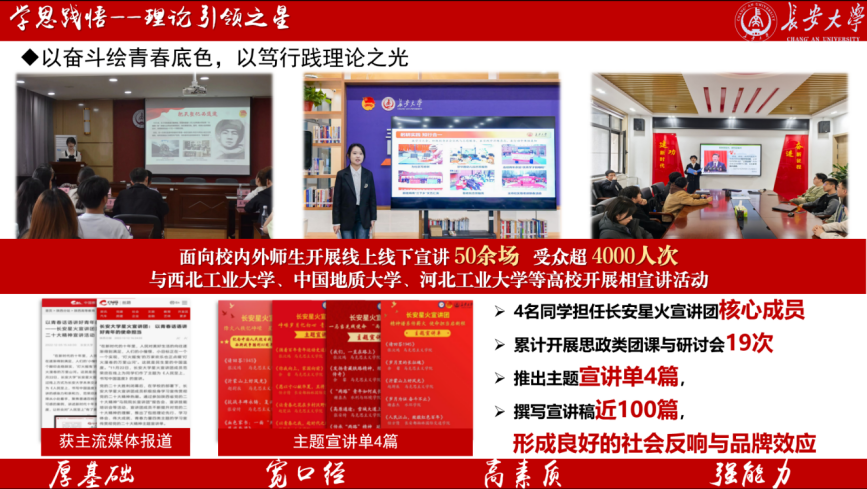 深培理论之根,乃发实践之华;浚通思想之源,方成传播之潮。本班立足专业特色,坚持“理论为本、实践为行”的育人导向,将专业学习与理论传播深度融合,4名同学担任长安星火宣讲团核心成员,累计开展思政类团课与研讨会19次,推出主题宣讲单4篇,撰写宣讲稿近100篇,面向校内外师生开展线上线下宣讲50余场,受众超4000人次,相关活动获西安新闻网等多家媒体报。班级成员参与录制的“大思政课·长大青年说”系列微视频,累计播放量突破5500次,有效提升了理论传播的吸引力和覆盖面,积极推动老员工讲思政课公开课活动开展,班级参与率95%,获奖率超60%,推动党的创新理论以青年喜闻乐见的方式广泛传播,充分展现了班级在理论阐释与教学转化方面的突出能力。