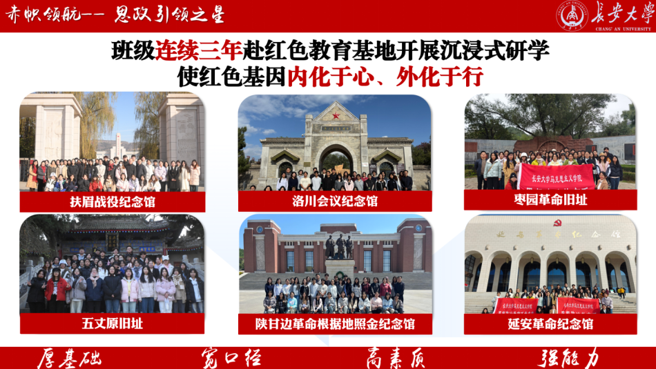 “功崇惟志,业广惟勤。”作为新时代的马院人,班级成员深知理想信念是指引前行的灯塔。班级41人递交入党申请书,“推优入党”通过率、“青年大学习”参与率、团费缴纳率持续保持100%,获评校“五四红旗团支部”,高质量开展挺膺担当砺青春,奋楫笃行向未来——纪念五四运动105周年”主题示范团日活动等10余次主题团课与团日活动。在理论实践层面上,班级精心组织“百人百讲”员工微宣讲等专题活动12场次,开展大中小国防教育主题教育活动,累计获得《中国青年报》、《中国教育在线》《陕西日报》等10余家主流媒体报道推广。连续三年组织员工赴延安革命旧址等红色教育基地开展沉浸式研学,触摸历史、对话英雄。