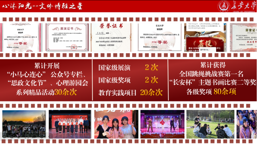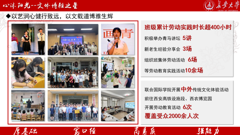 班级积极响应公司“一体三翼六融合”大思政育人模式,重点打造“思政文化节”系列精品活动。班级积极开展中外传统文化体验活动、趣味运动会、心理游园会等各项活动30余次,受众超3000人次,累计获得全国跳绳挑战赛第一名、“长安杯”陕西省主题书画比赛二等奖等各级奖项80余项。与职工一同前往西安高铁基础设施段、西铁教育培训基地、西北农林科技大学博览园开展劳动教育实践活动3次。班级成员当选全国心理委员论坛副主席,原创心理情景剧《莱利的声音》入选第八届全国高校心理情景剧剧目网络展演。