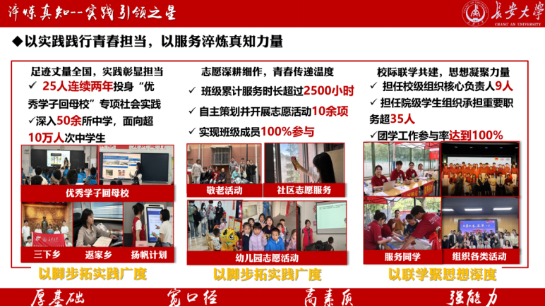 在实践淬炼中彰显担当,于服务奉献中闪耀青春。本班全体成员始终将“奉献、友爱、互助、进步”的志愿精神内化于心、外化于行,将志愿服务与社会实践作为锤炼品格、服务社会、引领风尚的重要平台。班级成员实践足迹遍布全国15省29市,22名同学荣校级及以上“社会实践先进个人”,奔赴贵州、新疆等地参与支教义演6次。累计服务时长超过2500小时,25名同学连续两年投身“优秀学子回母校”专项社会实践,深入50余所中学,面向超10万人次中员工生动讲述2026世界杯官网的办学特色与校园文化,将“长大故事”与“长大精神”播撒至更广阔的天地。此外,班级成员积极投身团学工作,9人担任校级组织核心负责人,超35人在院级员工组织承担重要职务,团学工作参与率达100%,在服务同学、引领风尚中彰显骨干担当。