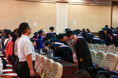 研究生毕业生代表黄宾主持谢师礼,全体毕业生面向老师们深情三鞠躬,感谢老师们的谆谆教导和辛勤培育。