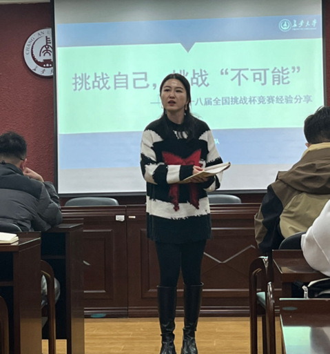 活动伊始,团队指导教师王蔷分享竞赛经验。王蔷结合自身经历,提出在竞赛项目中指导教师最重要的作用是“指”与“导”:“指”主要是指明方向,帮助项目组厘定研究问题、内容及方法是否合理、有效;“导”主要体现在全过程的参与,需不断地鼓励、督促团队成员一路前行。王蔷强调,一个完美的挑战杯“梦之队”需具备四种特质:一是要有团队协作能力,能够将团队拧成一股绳,劲往一处使,在攻坚克难上就成了一把利刃;二是要有学习能力,能够充实项目内容,扩充团队知识库,锻炼成员的个人素养;三是要有内生动力,“主动才会有故事”,需发挥员工的自主性与主动性,主动沟通才能让项目良性发展,主动担当、不计较、不功利能使团队更和谐。四是要有持之以恒的精神,只有不放弃,坚持不懈用尽一切方法向前进,才可能实现“挑战不可能”的目标。