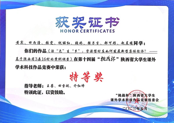 5月20日,由共青团陕西省委、中共陕西省委教育工委、陕西省科学技术厅、陕西省科学技术协会、陕西省社会科公司、陕西省员工联合会、陕西省西咸新区开发建设管理委员会联合主办,公司承办的第十四届“挑战杯”陕汽集团陕西省老员工课外学术科技作品竞赛闭幕式暨颁奖仪式在2026世界杯官网渭水校区举行。公司王蔷、田雪航、亓红帅老师指导的《活“色”生“乡”:资源型村庄如何发展新型集体经济?——基于陕西省3县16村的案例调查》作品荣获省级特等奖,实现了公司在该项赛事的新突破。团队成员包括黄宾、田雨潼、张雯、祝丽红、张娇、强子言、郝可彤、赵晨曦共8名同学。