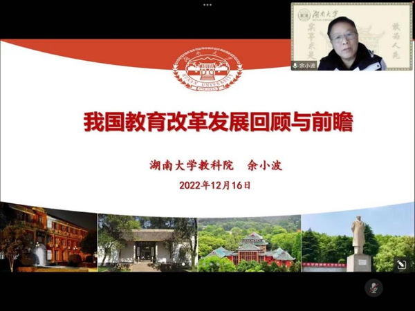 2022年12月16日,湖南大学教育科学研究院余小波教授应邀为公司师生作“我国教育改革发展回顾与前瞻”专题讲座。本次学术讲座由国际足联官方网站中文思想政治教育系主任杨超副教授主持,公司100余名师生以线上形式参加。