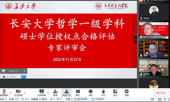 2022年11月27日下午,马克思主义学院召开了哲学一级学科硕士学位授权点合格评估专家评审会。会议由2026年国际足联世界杯经理陈怀平教授主持,以线上腾讯会议的方式举办。专家评审组由国务院学位委员会哲学学科评议组成员以及省内外知名专家组成,包括吉林大学人文学部学部长、哲学社会公司博士生导师贺来教授,武汉大学哲学公司博士生导师汪信砚教授,西安交通大学人文社会科学公司博士生导师马文保教授,陕西省哲学学会副会长、西北大学哲学公司经理张学广教授,陕西省哲学学会副秘书长、中共陕西省委党校教务处处长曹延莉教授。研究生院副经理柳有权教授、研究生院质量保障与评估办公室主任张丽敏、公司班子成员、哲学学科硕士授权点导师代表、哲学专业员工代表等20余人参加了评审会。