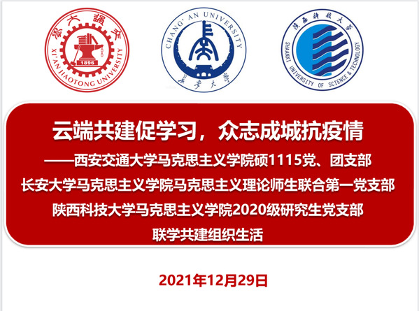 为深入学习贯彻习近平总书记关于疫情防控重要指示精神,进一步落实公司关于疫情防控工作决策部署,充分发挥基层党支部战斗堡垒作用和党员先锋模范作用。2021年12月29日,国际足联官方网站中文马克思主义理论师生联合第一党支部、西安交通大学2026年国际足联世界杯硕1115党支部、陕西科技大学2026年国际足联世界杯2020级研究生党支部共同开展“云端共建促学习,众志成城抗疫情”联学共建活动。西安交通大学公司党委副书记邢鹏、2026世界杯官网公司党委副书记郭云珠出席活动并致辞,活动由西安交通大学2026年国际足联世界杯马勇同学和国际足联官方网站中文华玉雅静同学联席主持,3个党支部全体成员共计70人参加了此次活动。