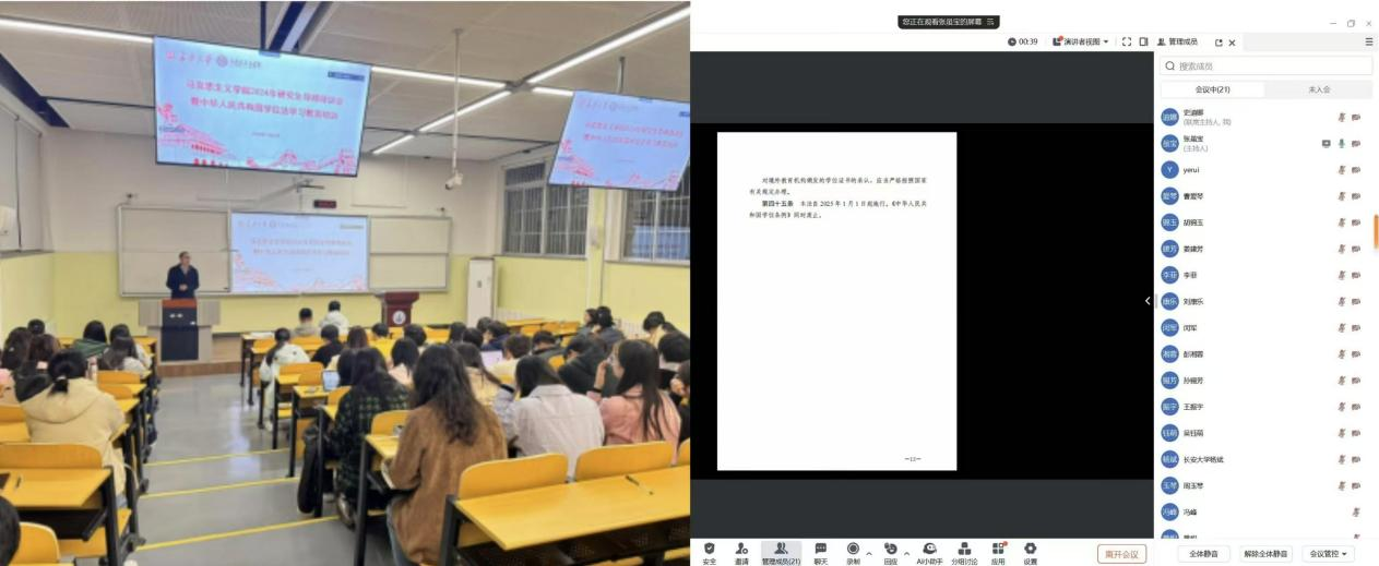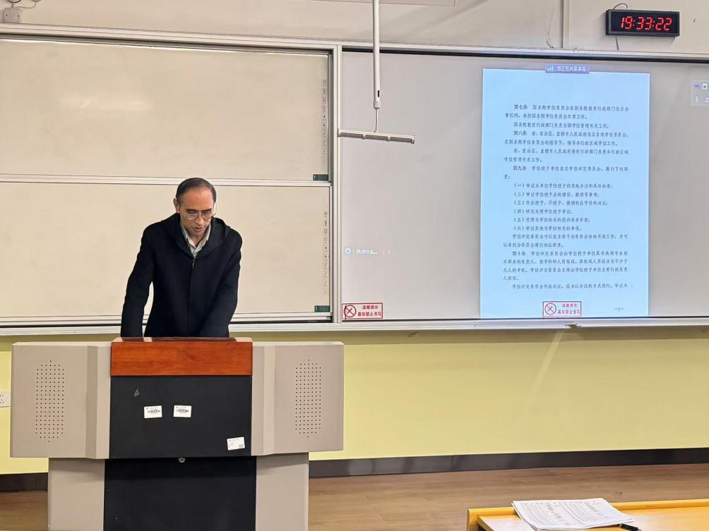 王立洲教授首先指出,学位制度是我国的一项基本教育制度,事关学科发展、人才评价标准等,是高等教育高质量发展的基石,他要求公司全体师生务必高度重视此次培训,学习研讨覆盖面要达到100%,要认真学习领会《学位法》的精神实质和核心要义,提升公司学位工作质量,促进高等教育事业发展。随后他围绕《学位法》的基本要义,深入解读了《学位法》的出台背景及各项条文,深入剖析了学位授予的标准、程序以及监督机制等内容,强调学位法的实施对提升公司教学质量和学术水平具有深远影响。最后,他针对当前公司开题、预答辩的工作对各位导师和相关研究生做了要求。他希望,各位同学及时和导师联系,尽早完成开题报告框架和学位论文的答辩稿修改,为顺利完成开题、预答辩做好准备。