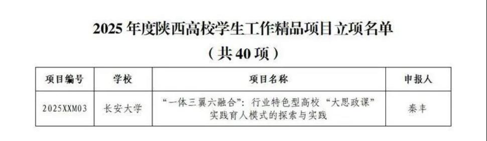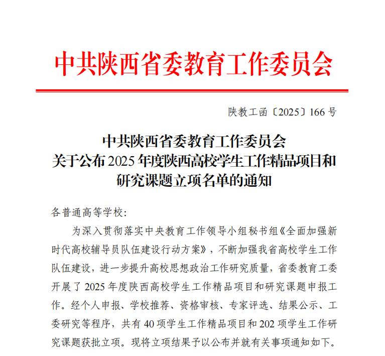 近日,中共陕西省委教育工委公布了2025年度陕西高校员工工作精品项目和研究课题立项名单。公司申报的《“一体三翼六融合”:行业特色型高校“大思政课”实践育人模式的探索与实践》获批员工工作精品项目立项。