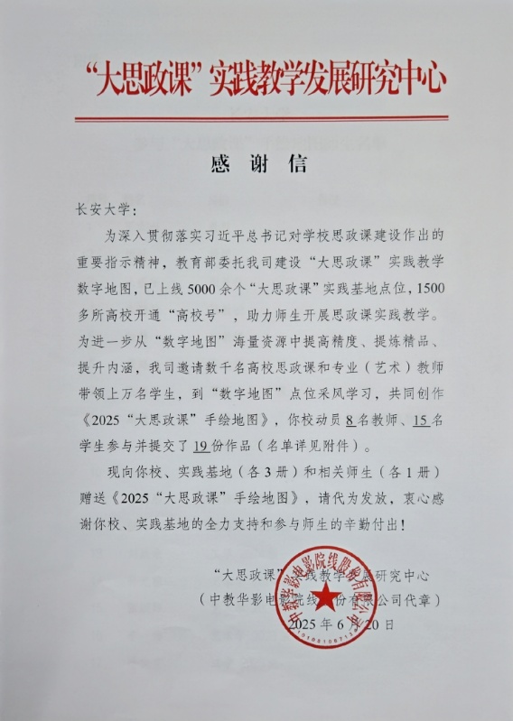 此次入选是对我院创新开展“大思政课”实践教学工作的充分肯定,教育部“大思政课”实践教学发展研究中心特向公司发来感谢信。
