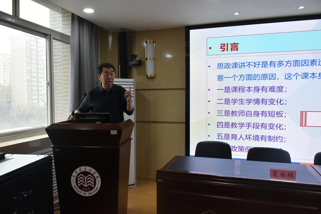 夏永林以“把准课程定位 凸显思想属性——以概论课为例”为主题,作了一场精彩的教学培训。他从“问题提出”“重要维度”“教学要点”三大层面展开深度剖析,重点总结了讲好“概论课”的几个重要方面。一是研读教材——把握好课程边界的基本要求;二是问题导向——教学具有针对性的基本标志;三是教学设计——教师教学能力与水平的体现;四是精于表达——教学具有吸引力的基本条件;五是熟悉党史——教师讲好概论课的必备修养,这些帮助我们彻底厘清了“教什么、怎么教、为何教”的核心问题。